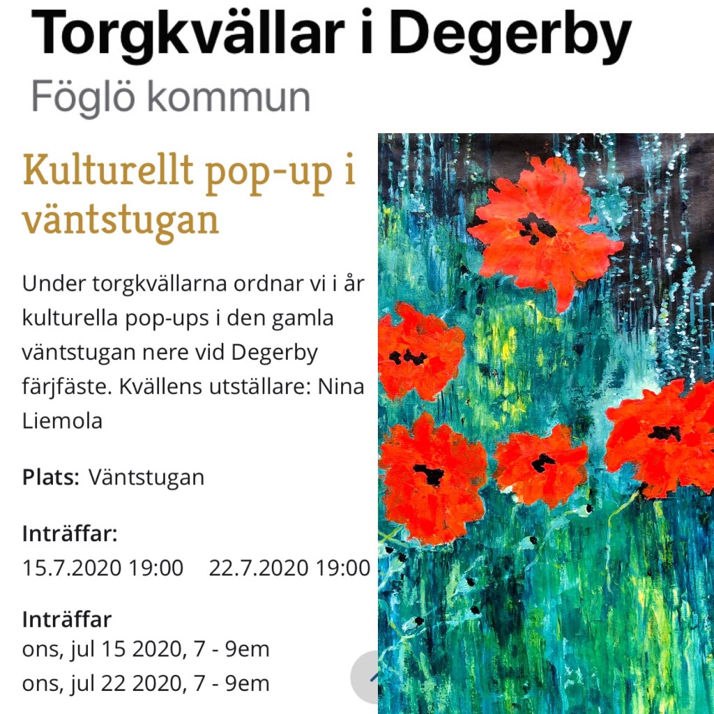 Torgkvällar på Föglö, a popup solo exhibition 8-15.7.2020 in ”gamla väntstugan vid färjfästet” invited by Föglö kommun, Åland.