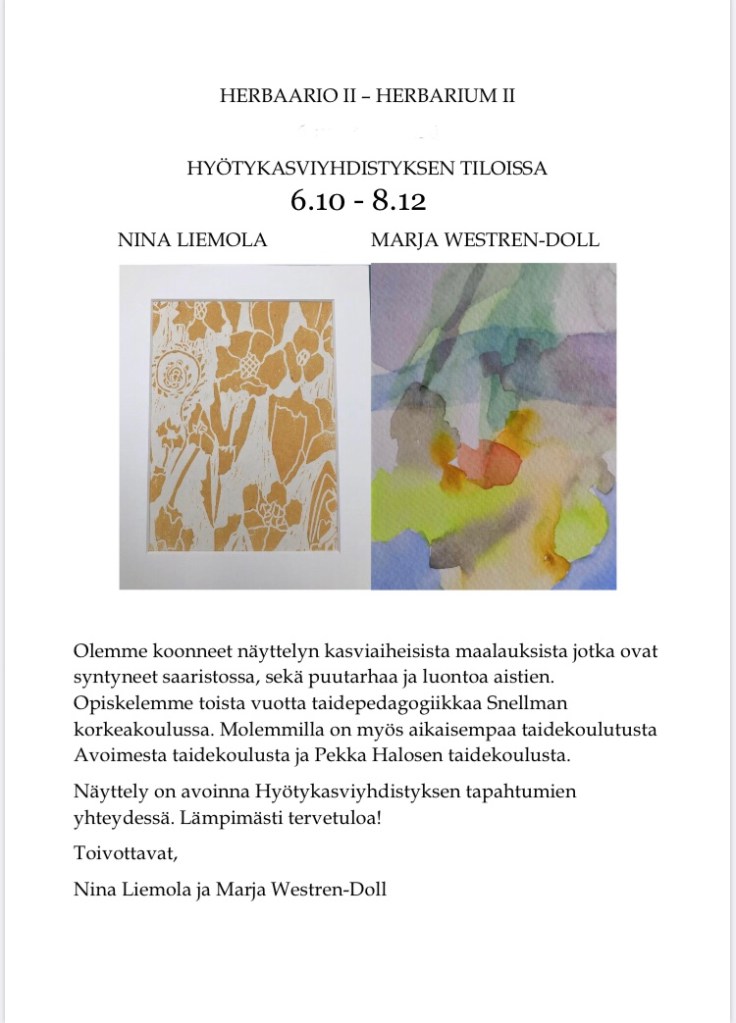 Exhibition at Hyötykasviyhdistys 6.10-8.12.2020 Posted on October 4, 2020 by artninaliemola, ninaliemola